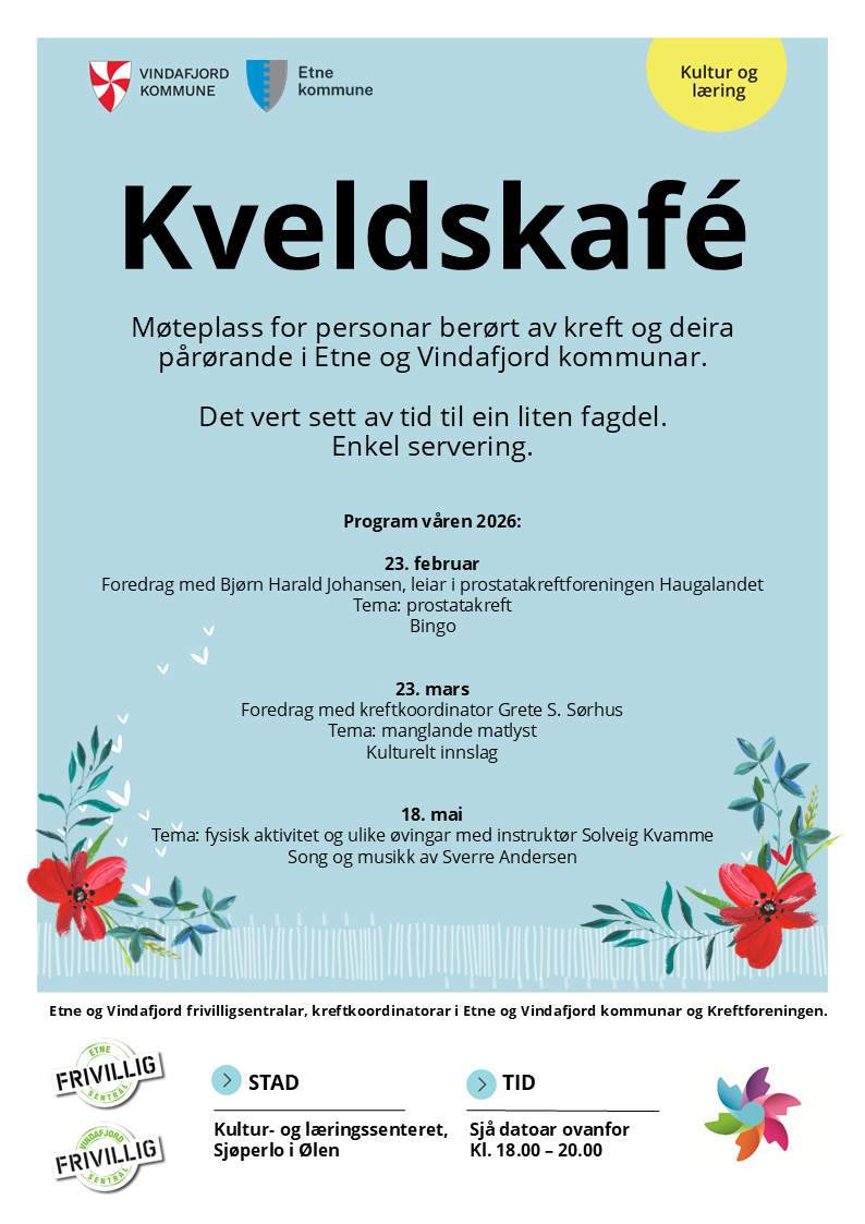 Kveldskafeen er eit samarbeid mellom frivilligsentralane og kreftkoordinatorane i Vindafjord og Etne kommunar og Kreftforeningen.