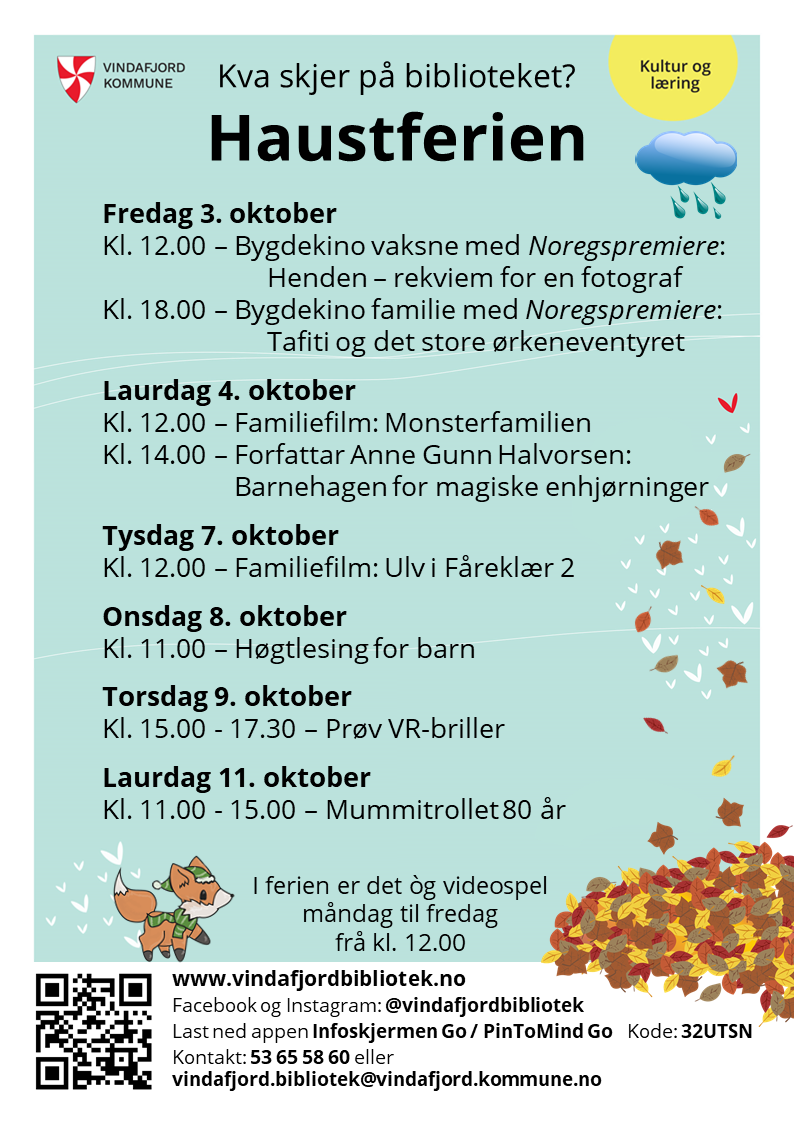 Skal du tilbringa haustferien i Vindafjord? Då kan du gle deg til ei veke med aktivitetar, opplevingar og gode møteplassar for både barn, ungdom og vaksne.