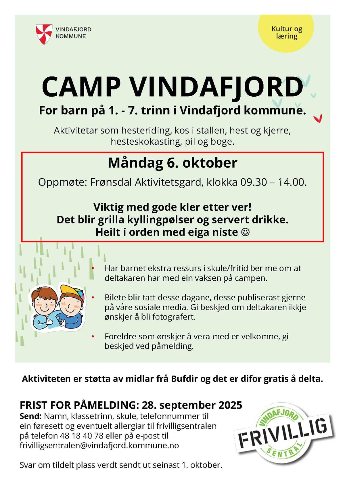 På Frønsdal Aktivitetsgard blir det Camp Vindafjord med hest og kjerre, bogeskyting og leik – ein aktiv dag ute i naturen for dei yngste.