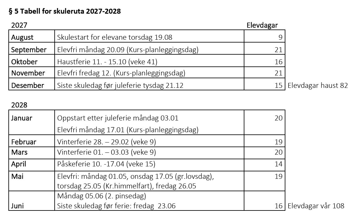 Forskrifta gir informasjon om kva skule- og feriedagar elevane har skuleåret 2027-2028. Elevane har rett og plikt til å møte på de fastsette skuledagane.