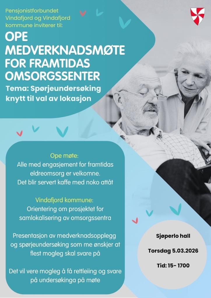 Pensjonistforbundet Vindafjord og Vindafjord kommune inviterer til ope medverknadsmøte på Sjøperlo 05.03.2026
