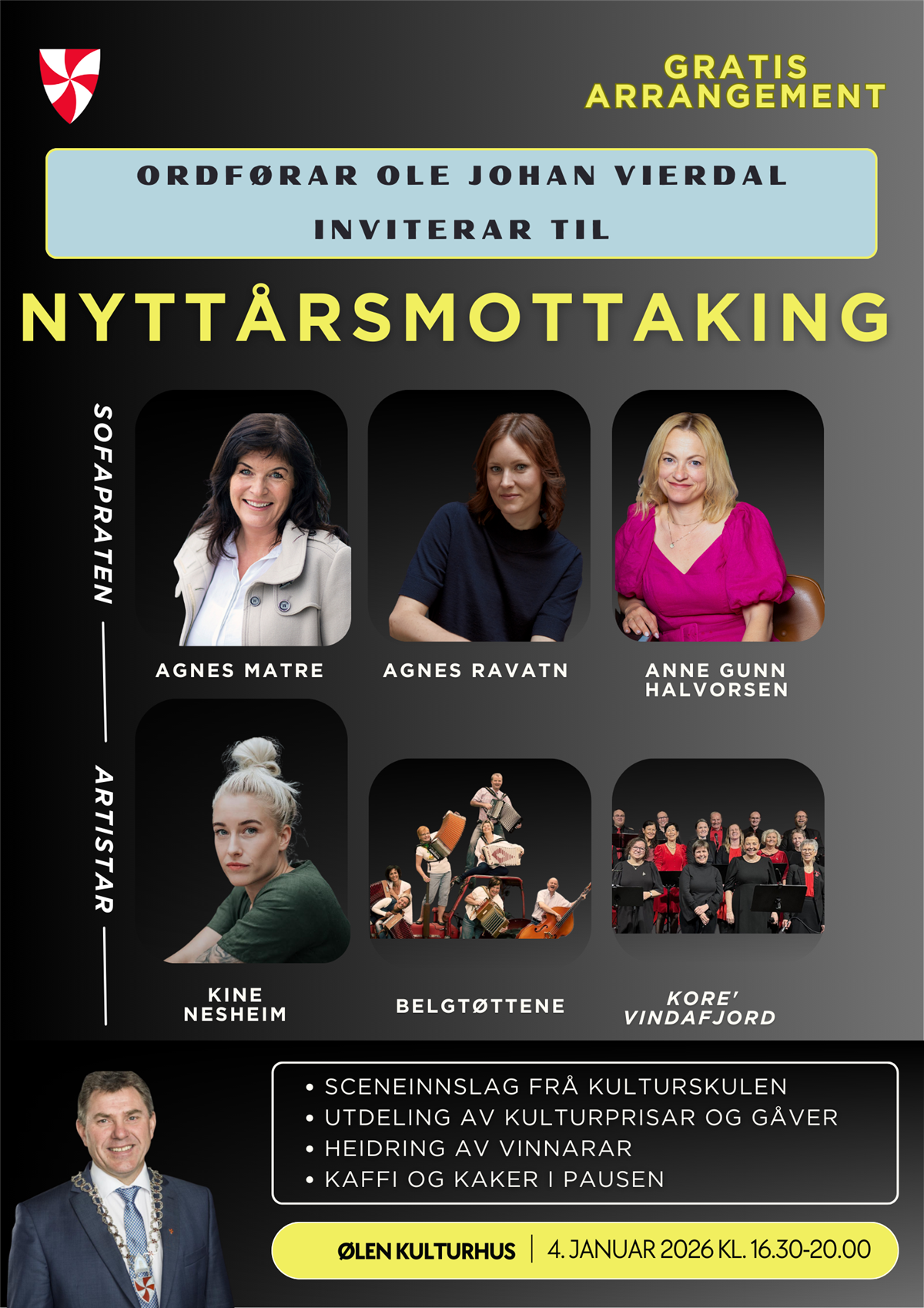 Ordføraren ønskjer velkomen til eit gratis arrangement 4. januar 2026 frå 16.30–20.00 i Ølen kulturhus.