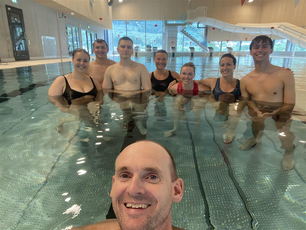 Tilsette i symjehallen: Frå høgre: Liam Hansen, Teresa Bakkedal, Camilla Tveit, Ann Rita Eike, Paul Nicolae Ratoiu, Vitalii Siabro og Gunn Karin Himle. Framme: Mangor Bårdsen.