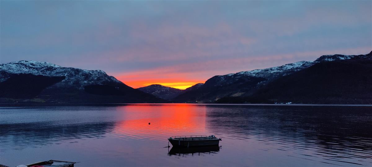 Gratulerer til Turid Kristine Rønnevik, som har fanga ein stillferdig kveld på Strand i Sandeid - med sterke fargar over fjorden.