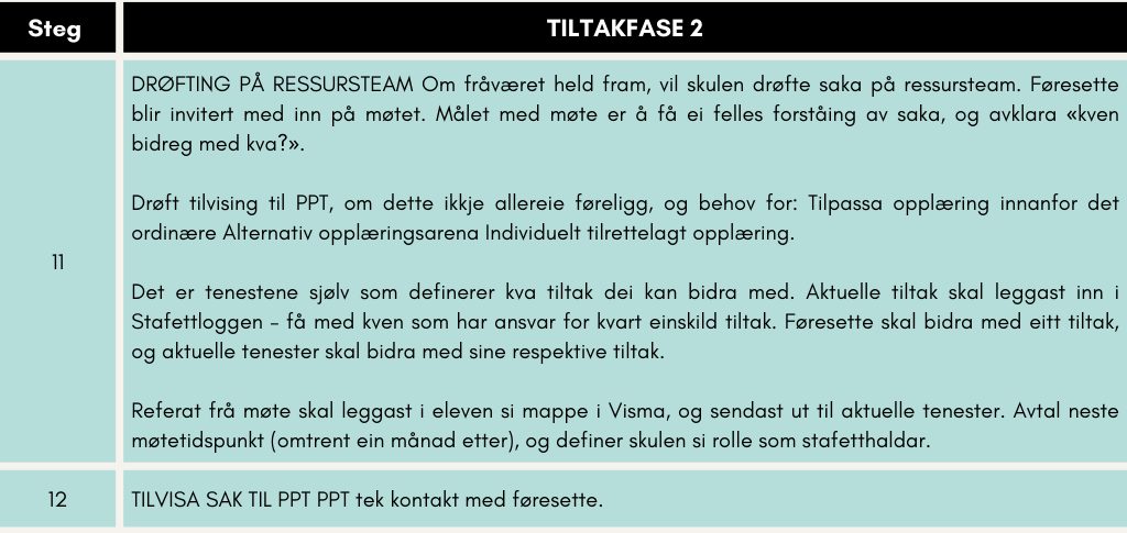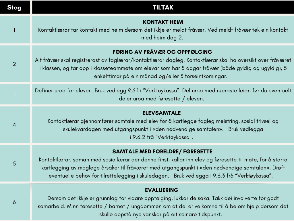 På trinnmøte og i klasseteam bør nærvær vere ein fast post på agendaen. Dette sikrar at arbeidet med nærvær blir kontinuerleg følgt opp, og at endringar eller utfordringar raskt kan fangast opp og handterast.