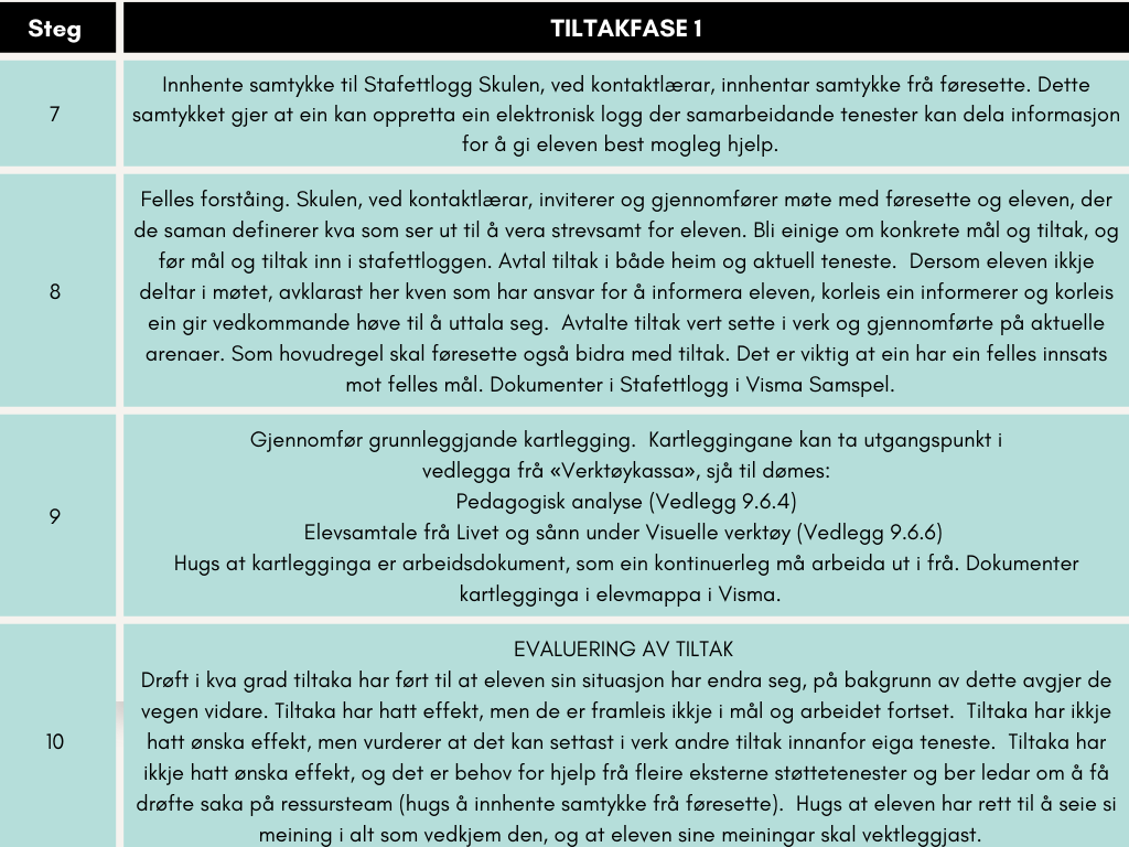 Eit ryddig informasjonsmøte i teamet eller kollegiet der saka blir presentert, med tydeleg ansvarsdeling og oversikt over tiltak, legg grunnlaget for heilskapleg og samkøyrt oppfølging.