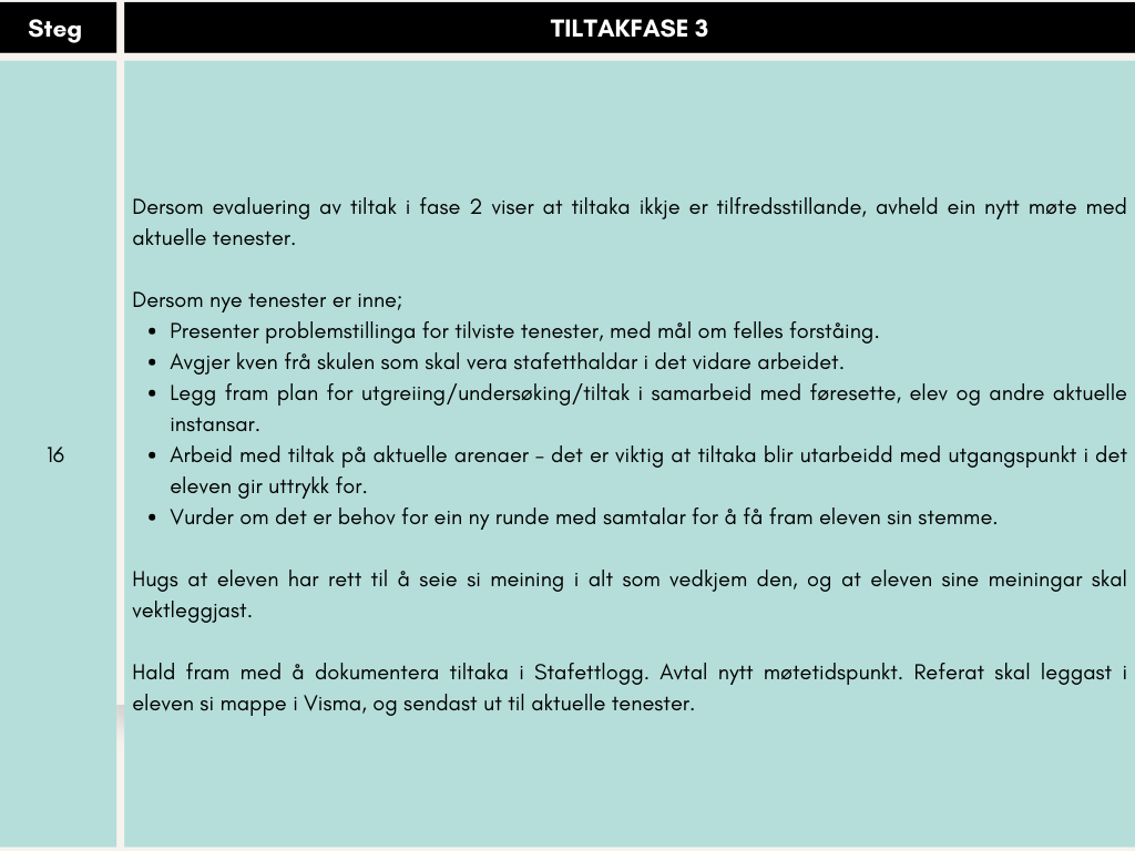 Møta skal dokumenterast i eleven si mappe i Visma Skole, og skal sendast ut til aktuelle tenester som er deltakande i saka.