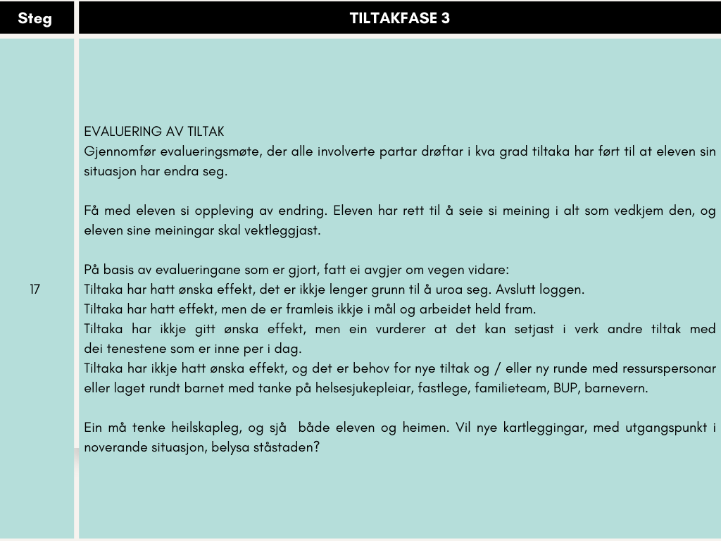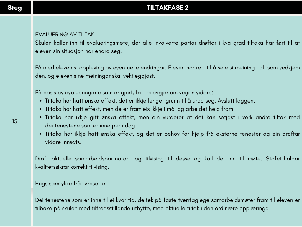 Eleven må vere med på å evaluere kva som må vere annleis no og kven som har ansvar for kva i oppfølgingsarbeidet.