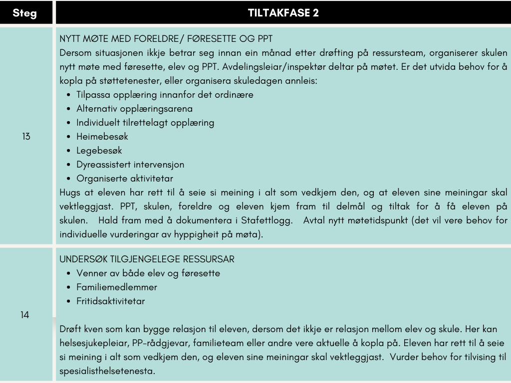 Ei tilbakeføringstrapp kan vere eit godt utgangspunkt for denne planen. Det er viktig å ta høgde for eleven sin kapasitet og situasjon, slik at ein unngår overbelastning.