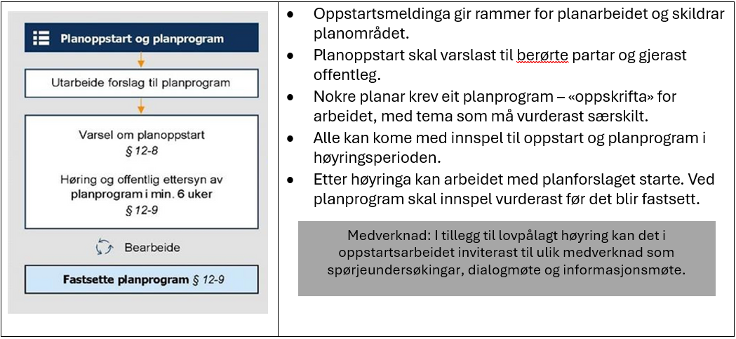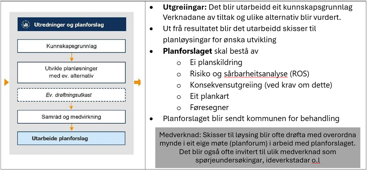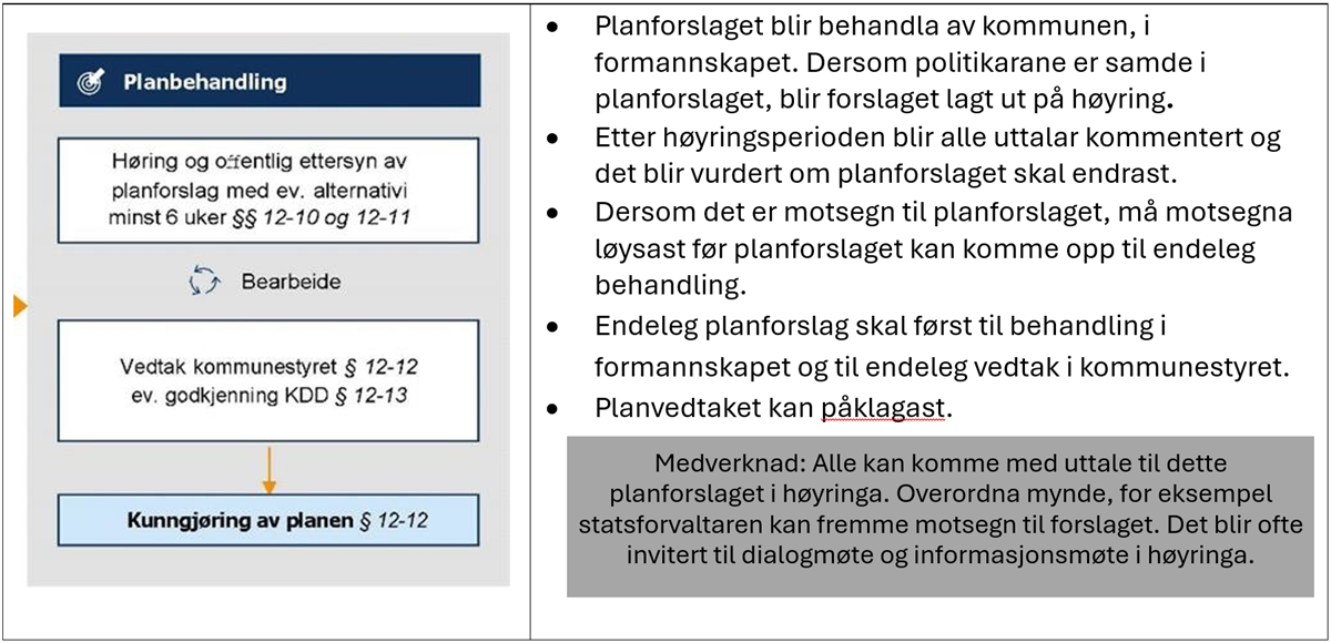 Kommunen har mynde til å gjere planvedtak etter plan- og bygningslova. Ein planprosess etter plan og bygningslova består av tre steg som er nærare forklart under. Denne prosessen er lik for plan- og bygningslovbehandlinga av eit vindkraftanlegg.