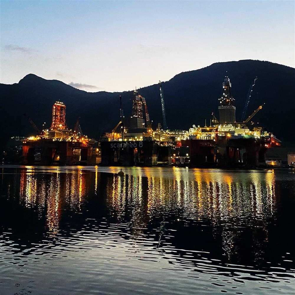 Tre riggar ved kai hos Westcon ei midtsommarnatt. - Klikk for stort bilete